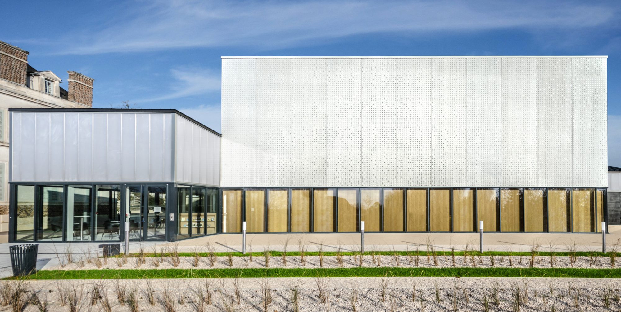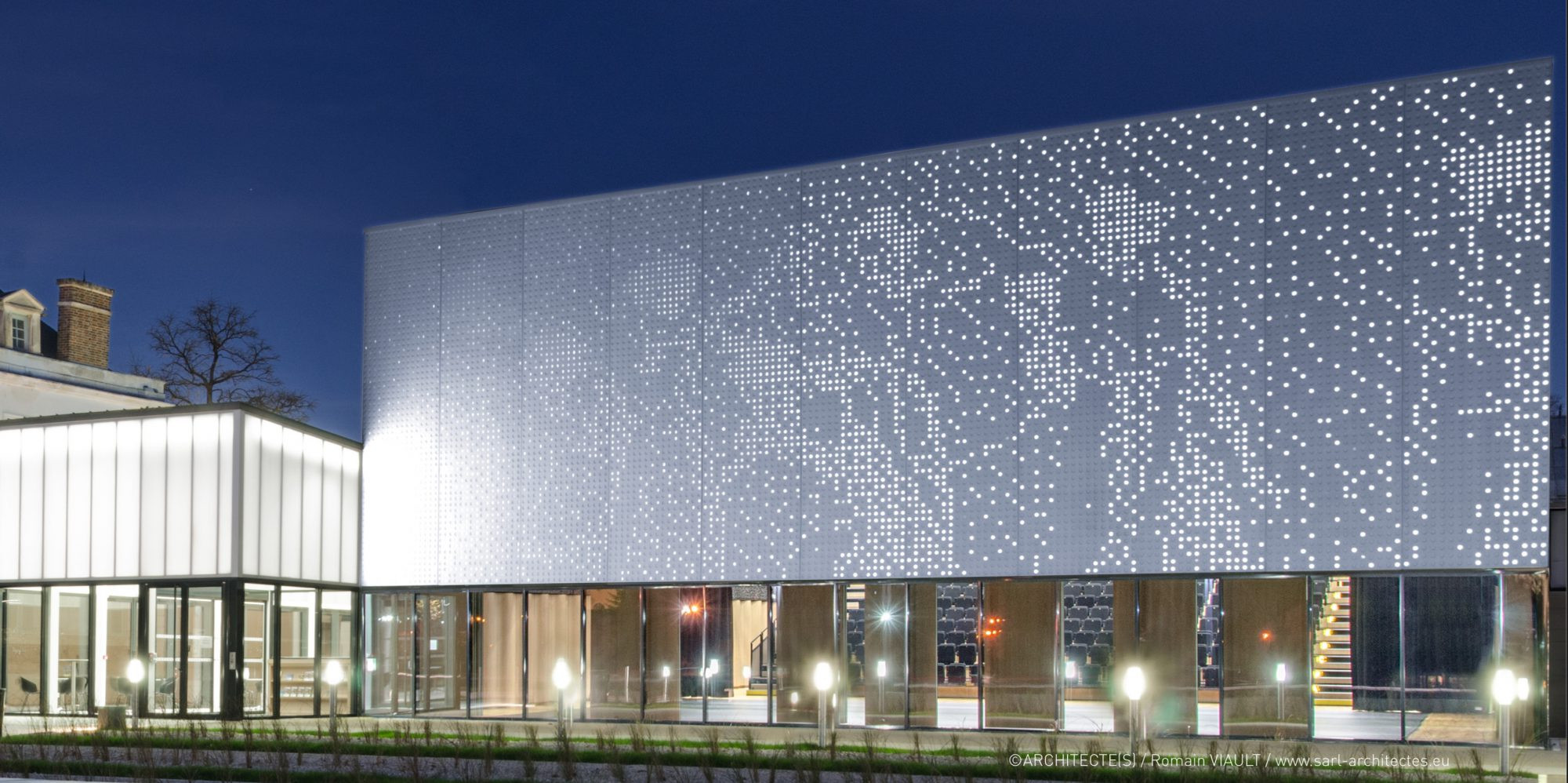 The façades of the new cultural centre are clad in white Ductal® elements, the largest of which exceed 7 x 1.90 m. Thousands of reflectors embedded in the panels reveal, at sunset, a sparkling façade that reproduces a whole palette of colours dreamed up by the architect. The surface treatment of the black GRC panels laid over other façades give them depth and pleasing aesthetics.
