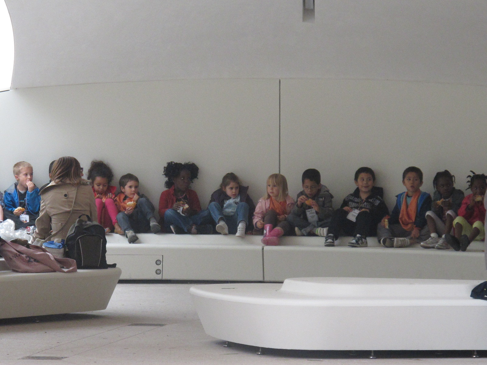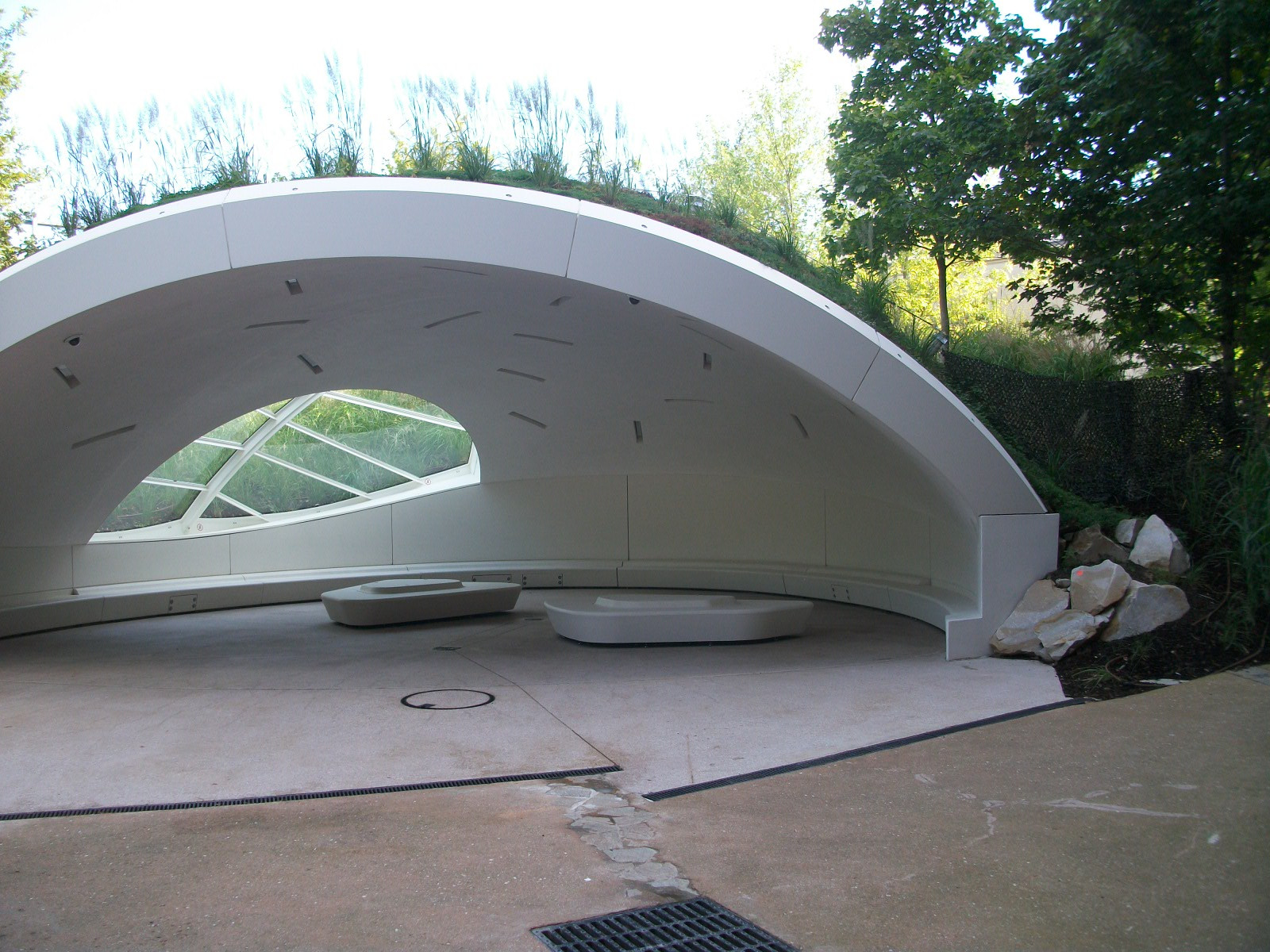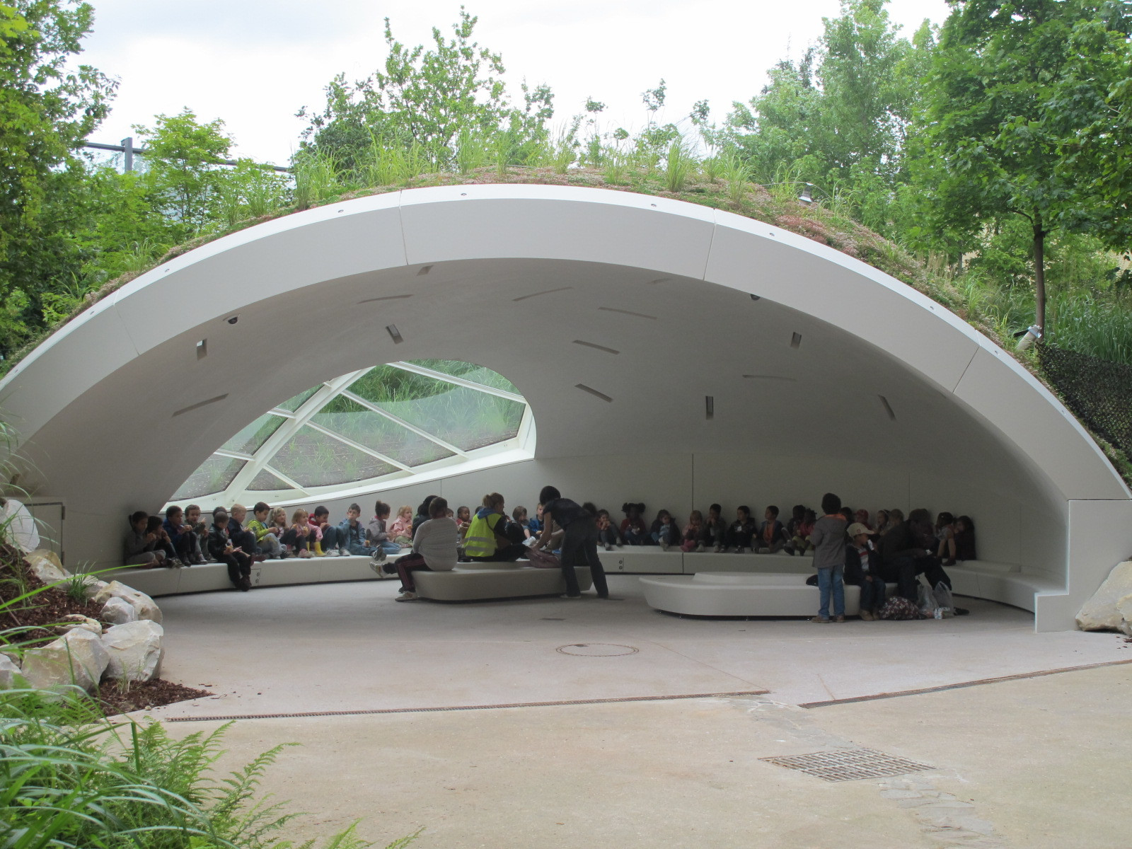 Installed at the foot of the Musée du Quai Branly, this shelter is designed for school groups. Made of sprayed GRC, the elliptical seats merge perfectly with the soft contours of this shelter, set in a green haven. Covers mask the electrical wiring along the walls of the shelter.