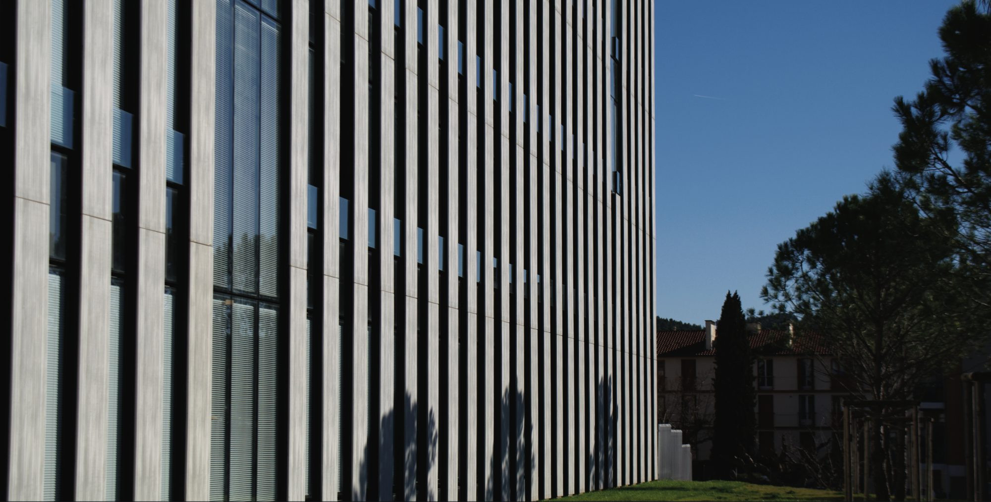 The one-storey high GRC panels conceal the uprights and the joinery blinds. On the basis of the architect’s sketches, Betsinor developed special tooling to reproduce the required texture on the mineral facades of the facility.